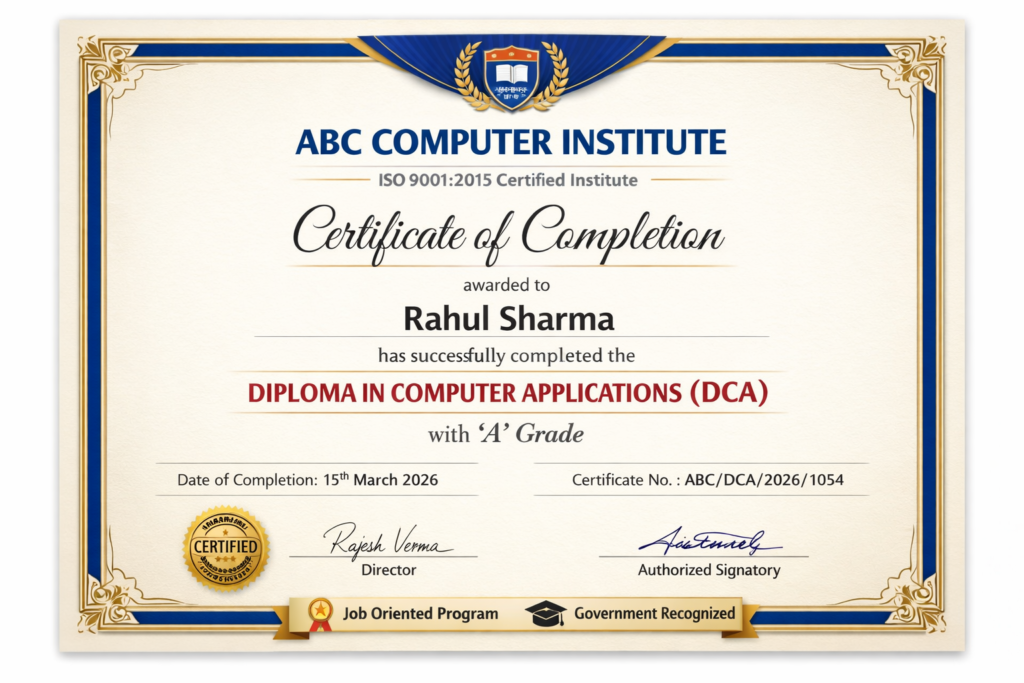 DCA / PGDCA course complete karne ke baad students ko valid aur recognized certificate diya jata hai jo private aur government jobs me helpful hota hai.